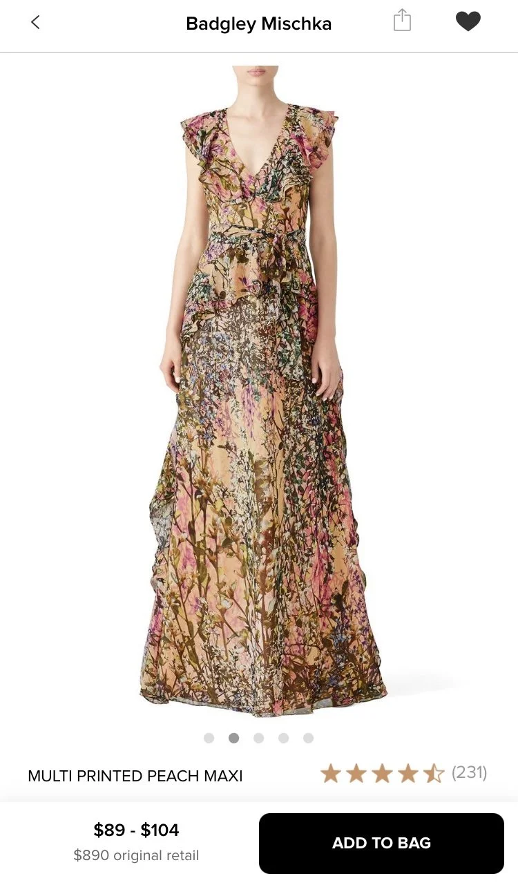 Gown or tea length cocktail dress is proper. Rental options and styles provided as reference.